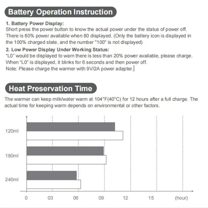 - 【Portable & Rechargeable】Mumgaroo portable bottle warmer with a large 9000mAh battery, battery powered, compact and portable, takes up little space in a diaper bag and travel with your baby. Equipped with 3ft USB cable, it can heat continuously for 40 minutes on a full charge, or keep 4 oz of milk warm for 12 hours. This means you will be allowed to feed your baby anytime, anywhere.