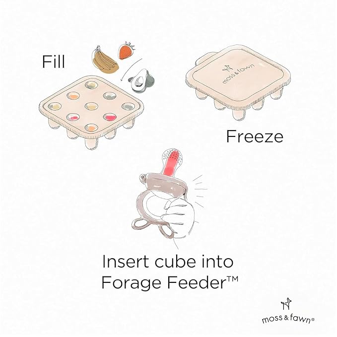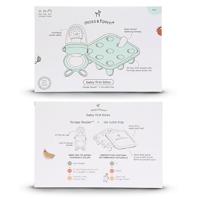 - Solids for Teethers | Feeding kit includes Moss & Fawn’s Forage Feeder and Ice Cube Tray for introducing babies to solid foods and helping to soothe teething.