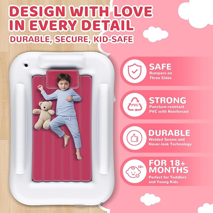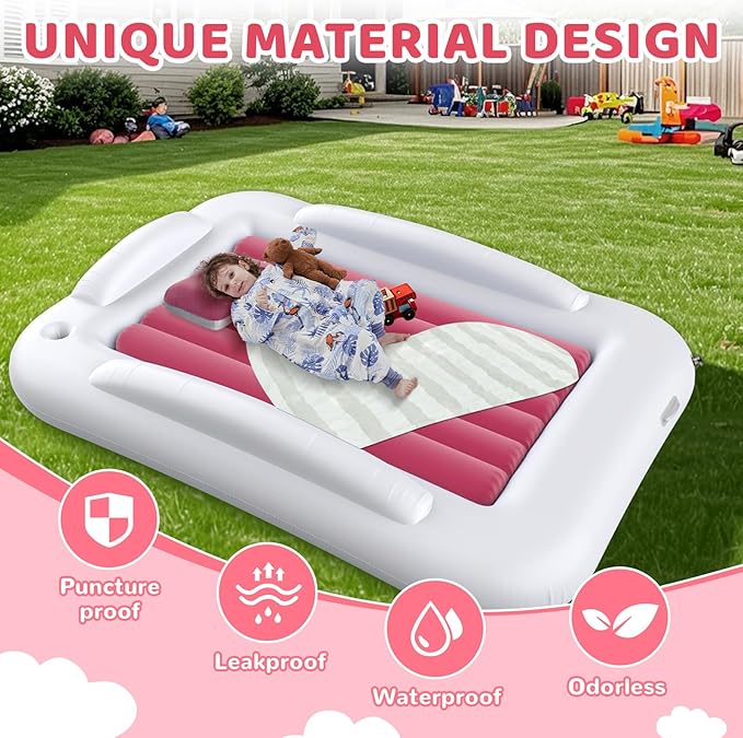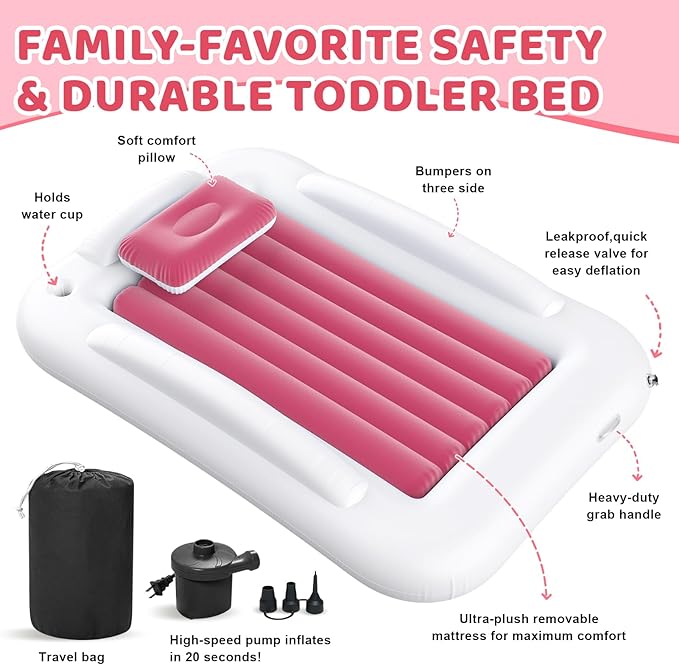 Deeteck Inflatable Toddler Travel Bed - 60 Inches Portable Toddler Bed for Travel with Safety Sides - Cozy Kids Air Mattress Set with High-Speed Pump & Carry Case - Lightweight & Easy to Inflate(Pink)