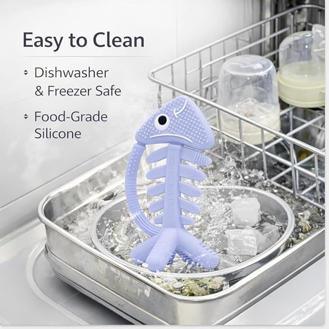 - Designed With Pediatric Dentists: Created by baby-toy specialists and pediatric dentists, this double-sided silicone teething toy features textured fins, tail, head, and bones to massage gums safely. Made from premium, odor-free, food-grade silicone. Super soft baby teethers (11 colors). ASTM & CPC tested, BPA-free, dishwasher and freezer safe.