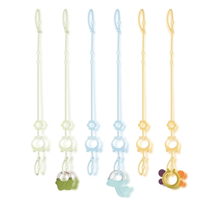 - Easy to Clean and Sterilize: Made of food-grade, heat-resistant silicone, our stroller toy straps are easy to wash in water or put in a dishwasher or sterilizer for cleaning. The set comes with 6 toy holder straps in 2 Light green, 2Light blue, 2 Light coffee. The design helps promote baby visual, motor, and sensory development