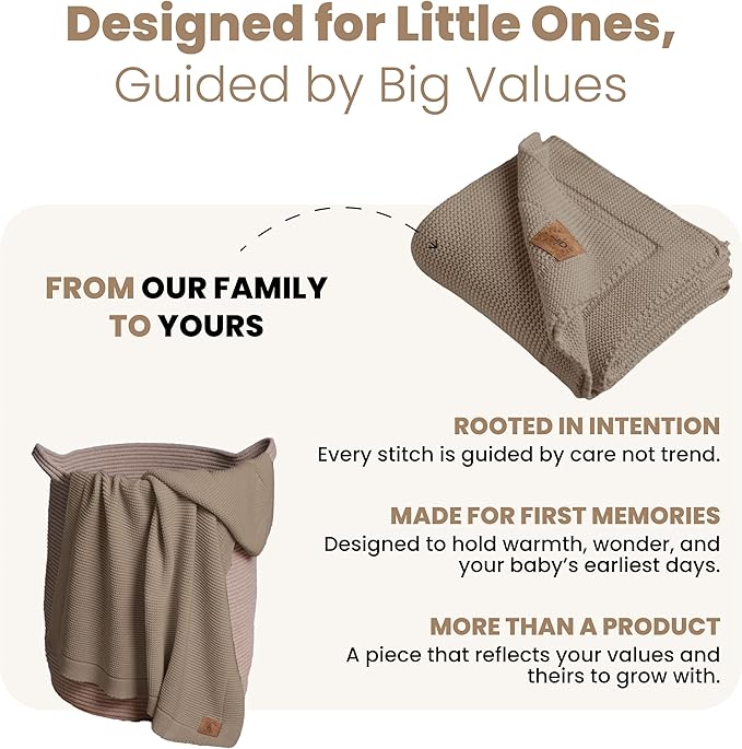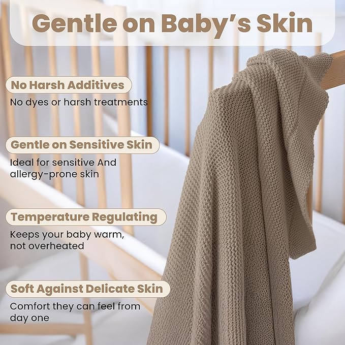 - Style : The style of this product embodies classic elegance with a modern, eco-conscious touch, making it a timeless addition to any nursery. Its cable knit design reflects traditional craftsmanship while adding texture and sophistication, appealing to parents with refined tastes. The neutral and soft color palette complements a variety of nursery themes, whether minimalist, Scandinavian, or boho-chic. The inclusion of a vegan leather tag adds a contemporary and stylish detail, showcasing both sustainability and luxury. With its understated yet elegant appearance, this blanket seamlessly blends functionality with aesthetic appeal, creating a product that’s both visually pleasing and versatile for modern families. The style of this product embodies classic elegance with a modern, eco-conscious touch, making it a timeless addition to any nursery. Its cable knit design reflects traditional cr… See more