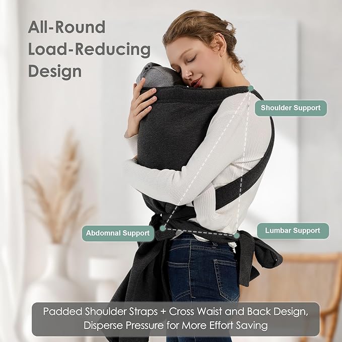 - Ergonomics for All: The baby wrap carrier features crossed straps that distribute weight evenly across the wearer’s upper body, helping to avoid pain or pressure points in the shoulders and back. This design makes it a back-pain-free option for baby wearing.