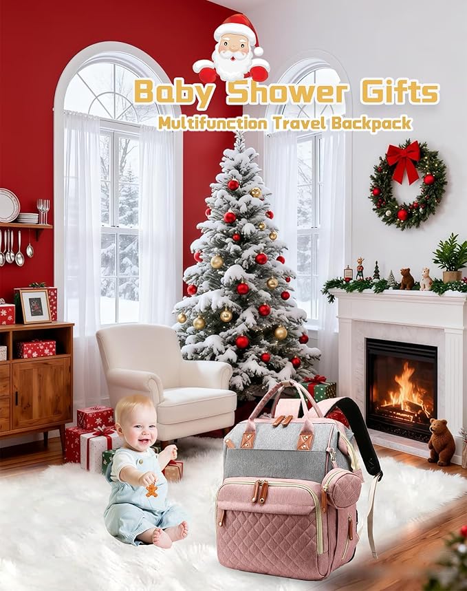 Diaper Bag with Changing Station, Waterproof 3 in 1 Baby Diaper Backpack with Foldable Changing Pad, Pink-Grey