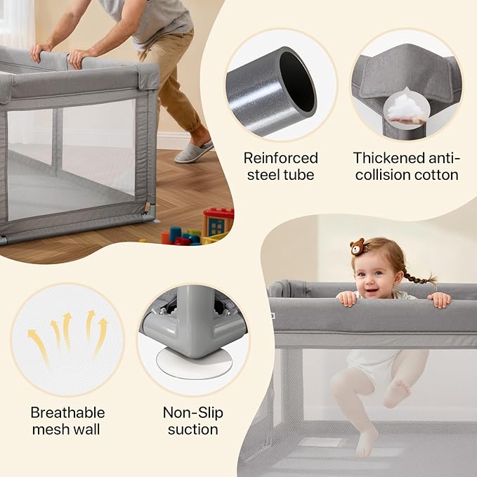 - đ¸ăDurable Material & US Safety Standard TestăCholena playpen is made of wear-resistant, tear-resistant cationic fabric /210D oxford fabric and strong steel pipes. All the top rails are padded with thicker sponge to prevent kids from being hit while playing. Baby's safety is our first priority, our play yards have finished test for lead and other toxic elements to meet or exceed government and ASTM safety standards