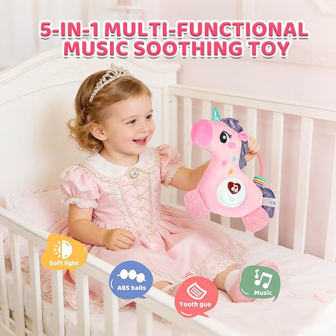 Baby Musical Activity Soft Toys with Sound & Light, Sensory Toys for Infant Developmental with Teether, Rattle and Textures, Soft Plush Toy for Newborn Gift 6 to 12 Months (Pink Unicorn)
