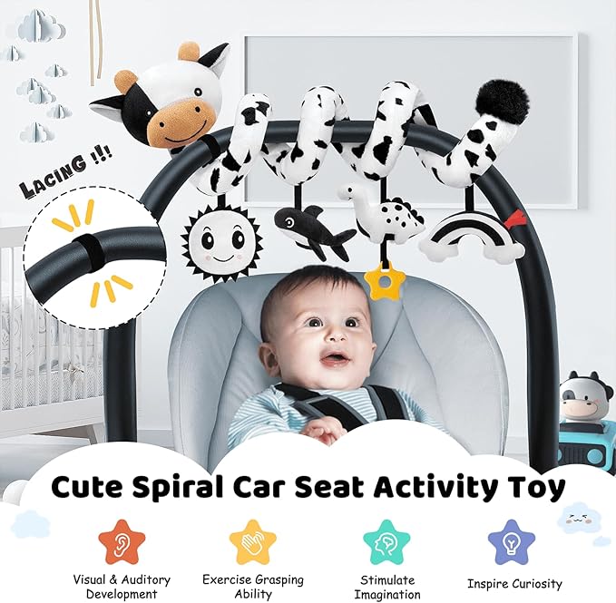Spiral Car Seat Baby Toys 0-6 Months, Infant Carseat High Contrast Sensory Toys Hanging Stroller Accessories, Newborn Shower Gifts for Baby Boys Essentials Stuff, Cute Black and White Cow