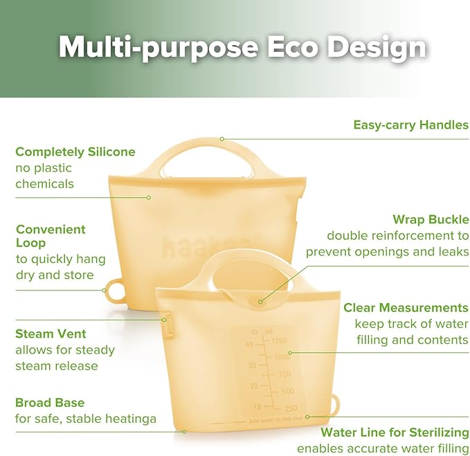 - TRAVEL-FRIENDLY & COMPACT: Haakaa’s lightweight, flexible silicone sterilizer bags roll up neatly into a compact size that fits easily into most bags, making them ideal for busy parents who need quick sterilizing on-the-go