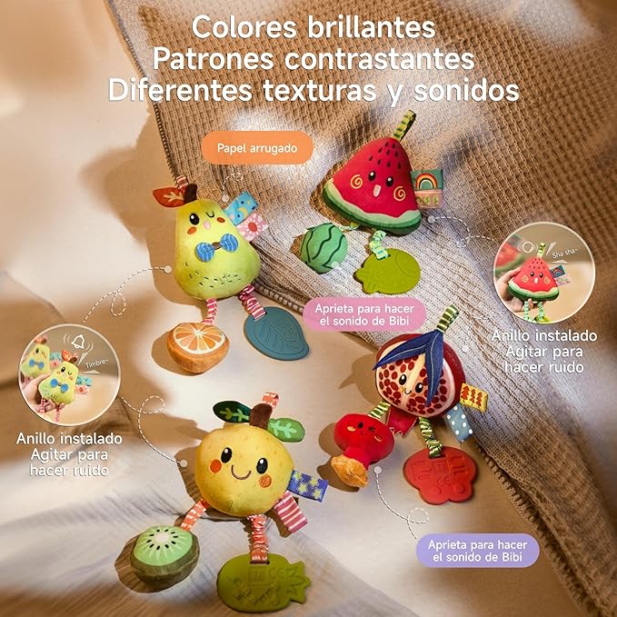 - MULTIi-SENSORY FRUIT RATTLE SET: Cheerful pear, watermelon, peach and pomegranate plush designs captivate babies with vibrant colors and textures. Stimulates sight, touch, and hearing—shaking triggers jingling bells/beads, crinkly paper rustles, and a soft "bi-bi" squeaker. Lightweight, safety-tested, and ideal for cribs, strollers, or playtime. Encourages sensory exploration through interactive sound play!