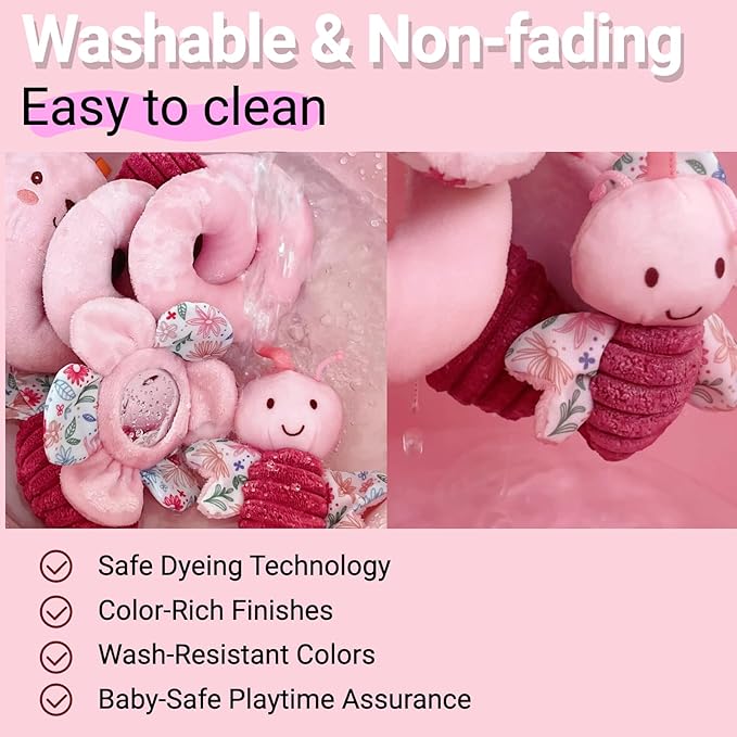 - DEVELOPMENTAL DESIGN: Converts from stroller toy to crib toys hanging system; Features baby toys 3-6 months baby girl toy 0-6 months need - dangling pink rabbit stuffed animals for babies, crinkle textures, and high-contrast elements for visual tracking