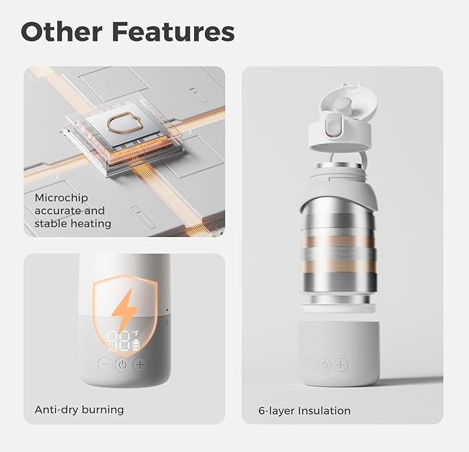 - Large Battery : Equipped with a 14,000mAh large battery and extended lifespan, it can heat 5 ounces of water to the specified temperature up to 16 times or heat the same volume of breastmilk up to 10 times on a single full charge, meeting your feeding needs throughout the day