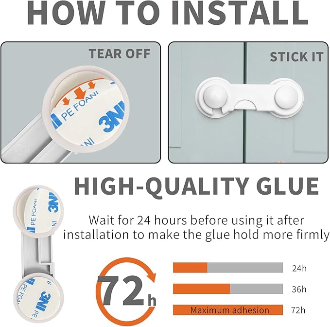 - Easy Installation: The installation of Cabinet Locks does not require a drill or other tools. Install Cabinet Locks easily with 3M tape.Wait for 24 hours before using it after installation