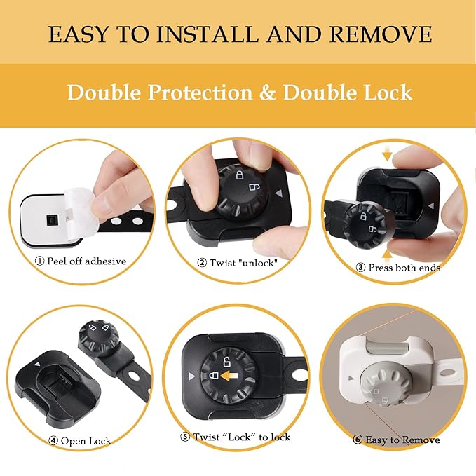 - Double Lock System: Baby Proofing Child Safety Locks Strap designed with double locking system rotary function, no need complicated passwords. easy open for adult, but it's hard to open for toddlers and children