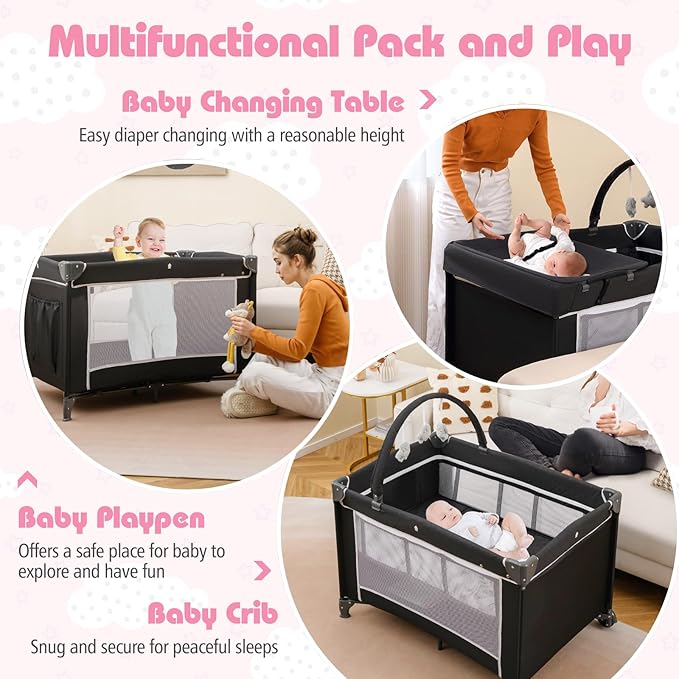 - 4-in-1 Pack and Play: Our 4-in-1 pack and play combines a baby crib for peaceful sleeps and a playpen for safe explorations. It easily converts into a bedside bed to keep your little one close at night, and even includes a changing table for quick, hassle-free diaper changes.