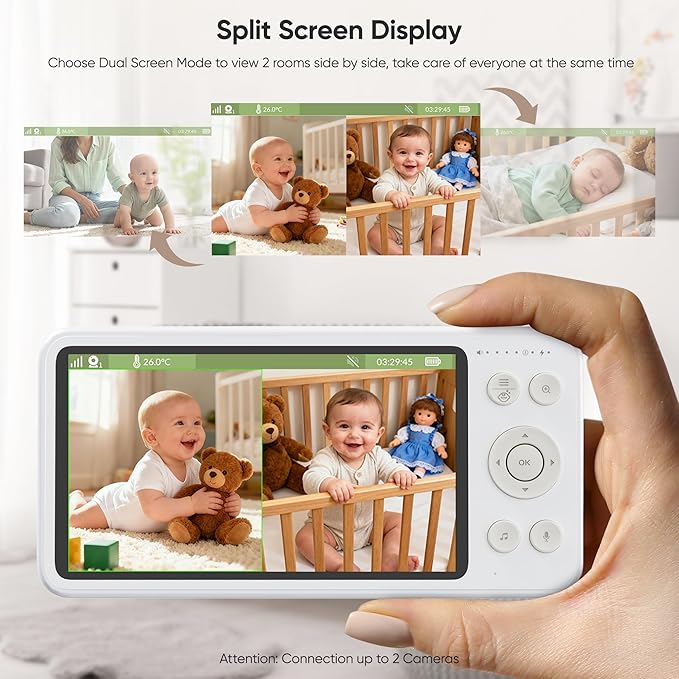 - 【Split-screen Display for 2 Kids 】- When two cameras are connected, press the ‘OK’ button for 3 seconds to turn on the multiple cameras scan mode, the bonoch baby monitor automatically loops real-time video from 2 cameras in single-screen mode every 15 seconds or in split-screen mode every 30 seconds, to get multiple rooms coverage.