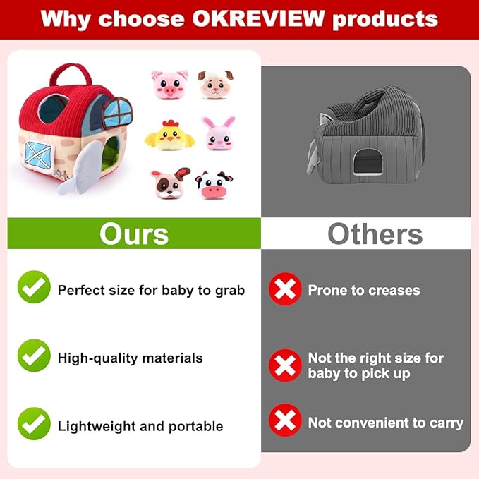 - Sensory Adventure: Specially designed for toys for 1 year old boy, this set invites little ones to explore the textures of farm animals, each filled with delightful rattles for unexpected surprises and endless joy. The satisfying crinkle sounds that accompany each gentle squeeze add a unique sensory experience, perfect for growing minds. The barn’s side mirror becomes a tool for self-discovery, promoting self-awareness and sparking moments of happiness. A wonderful addition to any collection of Montessori toys for 1 year old.