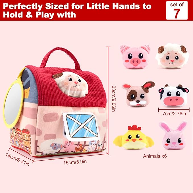 - Baby's First Farm Animal Collection: Baby's First Farm Animal Collection: This charming set, part of our baby toys collection, includes a cozy farm house and 6 lovable animals, crafted with care to bring joy to your little one. Made from soft, cuddly materials, these sensory toys are not only adorable companions, but also fantastic tools for sensory exploration and developmental play, fostering discovery and growth through hands-on interaction.
