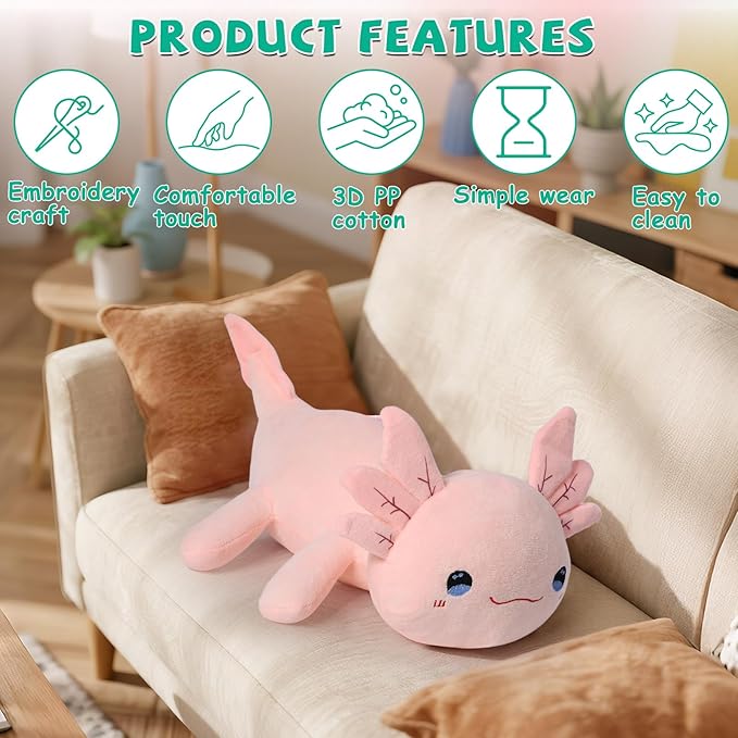 - Portable & Travel-Friendly:Axolotl stuffed animals Compact & lightweight—easy to carry in school bags, suitcases, or car rides, Great for airplanes, restaurants, or anywhere kids need a fun, cuddly companion.