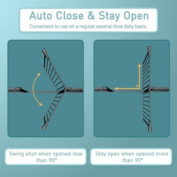 - 【Auto Close Gate & Easy to Use】The pet gate will be closed automatically due to gravity when the opening less than 90°. The opening angle more than 90°, it will hold-open. The door can be swing in both directions, easy to operate the gate with one hand. The sturdy construction ensures it can withstand constant use by both children and pets.