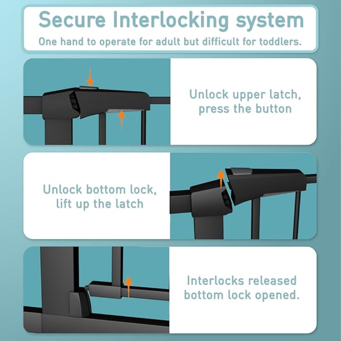 - 【One-Handed & Double-Lock】 Adults can press the buttons at the top and gently lift it with one hand to open the baby gate easily while keeping children and pets safely confined. Our safety gate features a double-lock system for enhanced security, ensuring peace of mind and preventing accidental openings.
