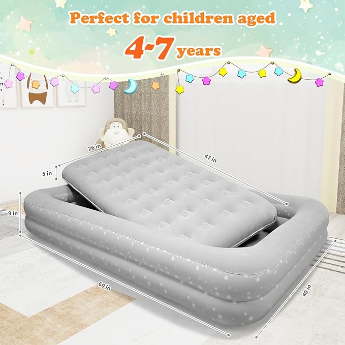 Air Mattress for Kids 4-7 Years - Toddler Travel Bed with Built-in Pump, Sides for Safety, Ultra Soft Plush Surface - Portable Kids Sleeping Pad for Camping, Hotels, Sleepovers & Grandparents' House