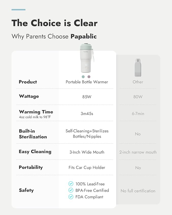 - 3-in-1 Convenience – Home & Travel: Papablic combines a traditional bottle warmer, portable bottle warmer, and portable sterilizer in one compact unit. Perfect for busy parents who want a versatile, space-saving solution.