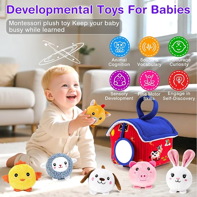 - MONTESSORI TOYS - NECTAR BABY plush farm animal toys include a barn and 6 cute farm animals brings lots of fun to babies while helps develop baby's hand-eye coordination skill, animal recognition, vocabulary, versatile sensory exploration and developmental play, perfect educational toy set for 1-year-old babies.
