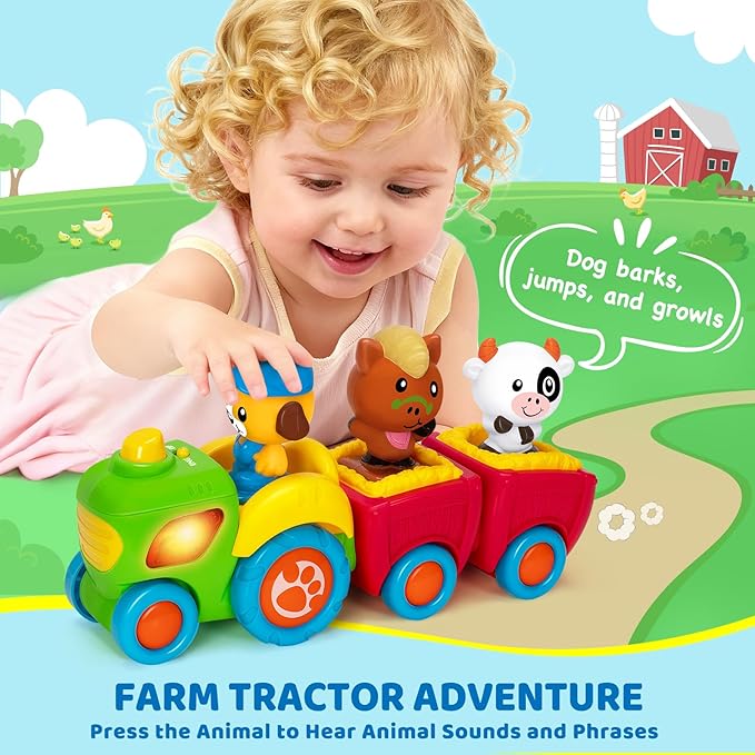 - Fun Animal Farm Tractor: Our tractor toys for toddlers 1-3 comes with 3 animal figures: dog, cow, horse, which can be fun for role play and shape matching. The push to go tractor is perfect for kids to play around the room, filling with music and laughter. This toy tractor is thoughtfully crafted to spark children’s imagination, boost creativity, and enhance motor skills. Perfect toys for kids age 1 2 3+ years old