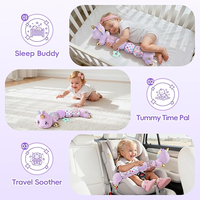 - Multi-Functional Soothing Companion: Not only a Cuddly unicorn toy, but also a perfect soothing companion for your baby during playtime and bedtime. Bring this baby girl toy on family trips, stroller walks, or tummy time to soothed and entertained your little one wherever you go. Ideal for carpets, cribs, and car seats, this infant girl toys is an essentials companion for newborns and tummy time.