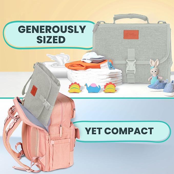 - Generously Sized yet Compact: Organized baby essentials with 2 inner mesh pockets, front storage bag (key holder and outer pocket), and easy-access wipes holder. Experience hassle-free diaper changes blending versatility and comfort. Our diaper changing mat is padded with a soft memory foam pillow. You can detach this extra storage space when you just need a simple changing pad! Equipped with a spacious 27” by 22” changing area, it folds into a compact 8" by 11" clutch for easy storage.