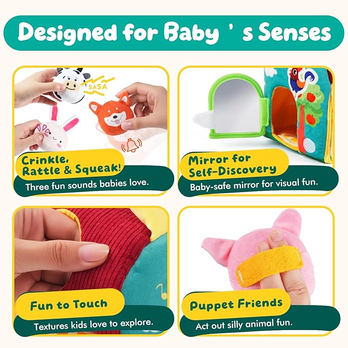 - 【Multi-Sensory Fun with Mirror】A baby-safe mirror promotes self-recognition and visual tracking. Paired with bright colors, textures, and sounds, the barn offers a full sensory experience to support early development.