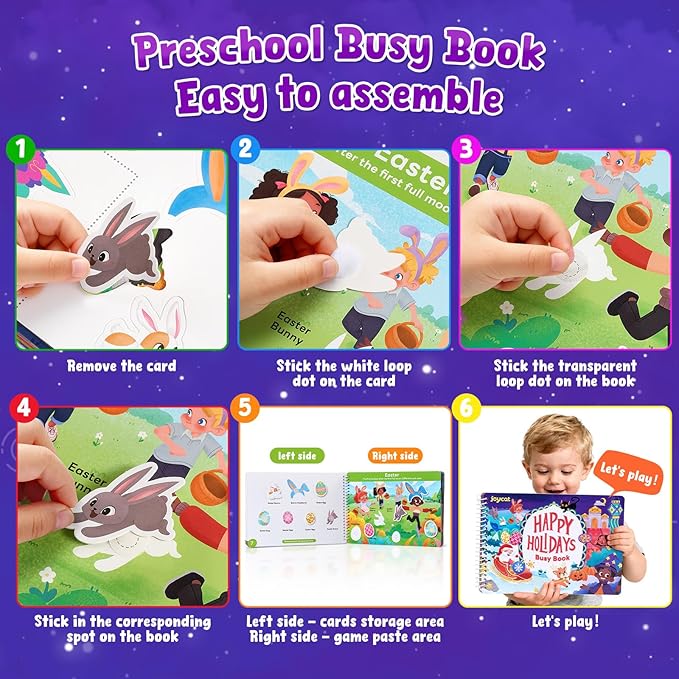 - JoyCat toddler busy book features 15 exciting holidays such as Easter, Diwali, and Thanksgiving. It encourages creativity and helps develop preschool skills, making it a fantastic companion for both home learning and travel