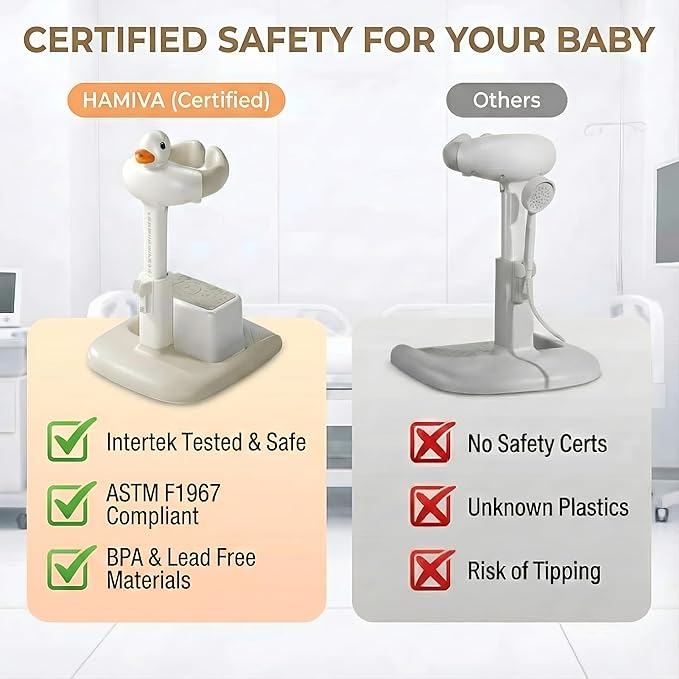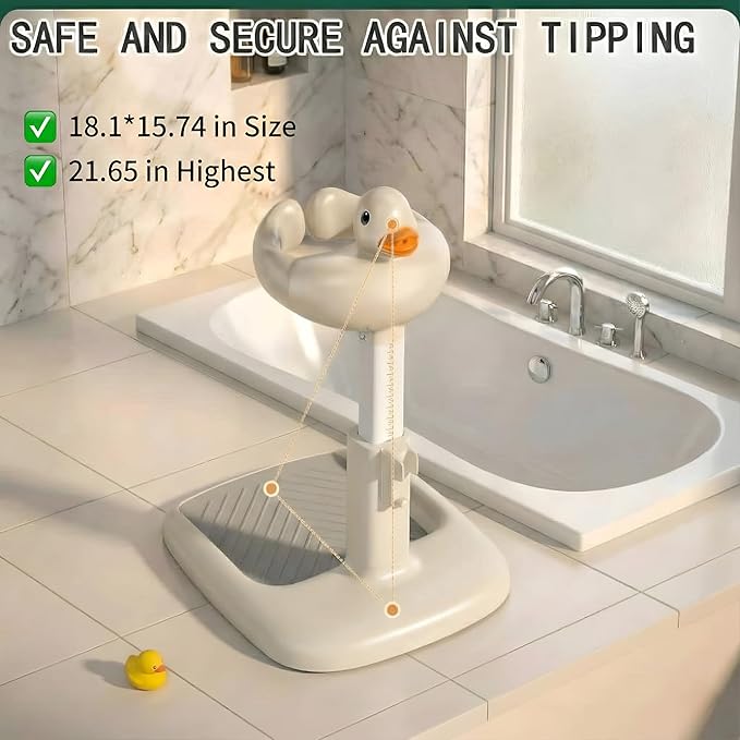 Hamiva Baby Bath Stand with Built-in Seat - Duck Design - Anti-Slip Base - Baby Shower Stand for Sitting or Standing (White Beige)