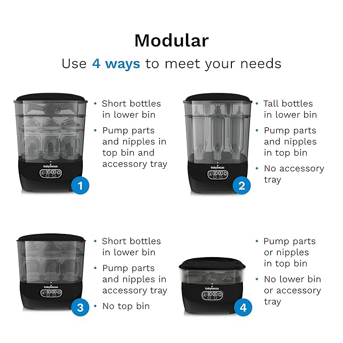 - MOST MODULAR 3-LAYER DESIGN: Use 4 different ways to meet your needs – Only Sterilizer Dryer with large lower bin, shorter upper bin and unique accessory tray; More convenient and easier to use than microwave sterilizer bags or UV sanitizers