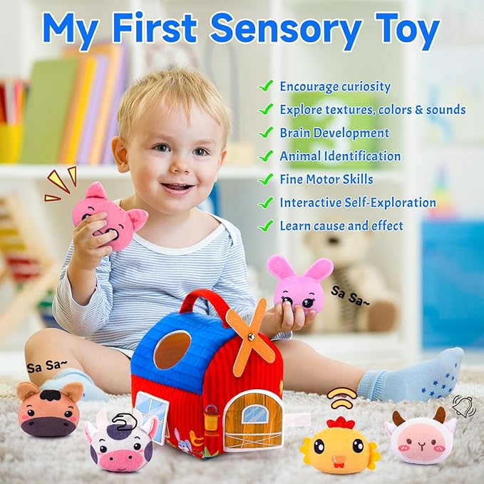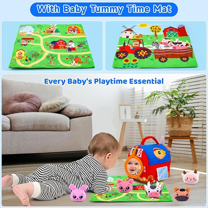 - Baby Toys Farm Animal with Tummy Time Mat: Includes a cozy plush barn, a farm-themed tummy time mat, and 6 cute animals sensory toys. Each animal features crinkle paper or gentle rattles, encouraging sensory discovery baby and promote brain development through touching, pressing, shaking, hearing, and playing. Help develop fine motor skills and early learning while providing endless fun