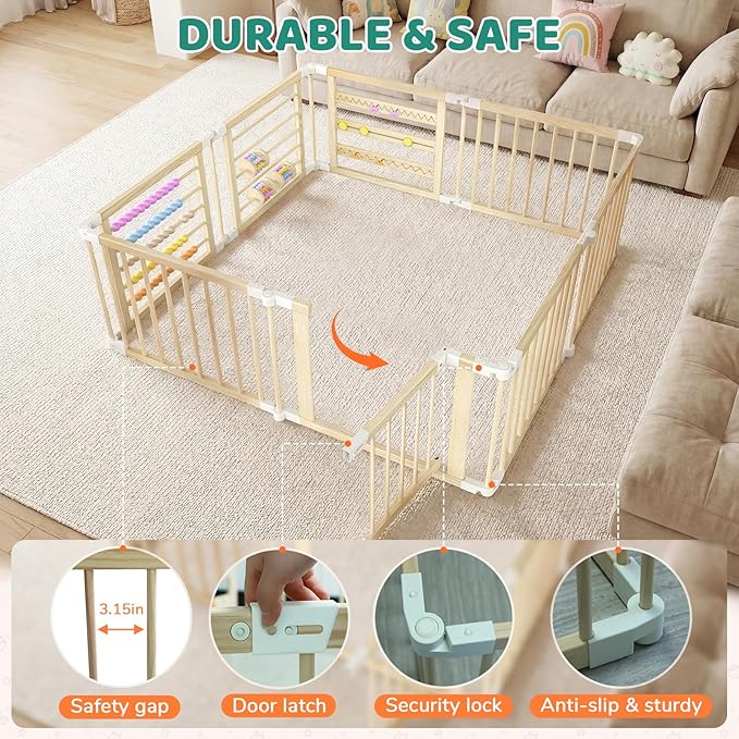- 【Easy to Use, Quickly Assemble】 Get instant safety and fun. Setting up this wooden play pen is a breeze – just follow the instructions to connect the 8 wooden panels and connectors in order.The no-tools setup makes this baby wooden playpen incredibly convenient for daily use at home or as a portable kids play pen for visits to grandparents.
