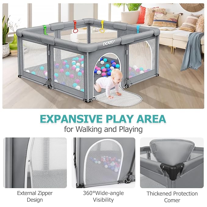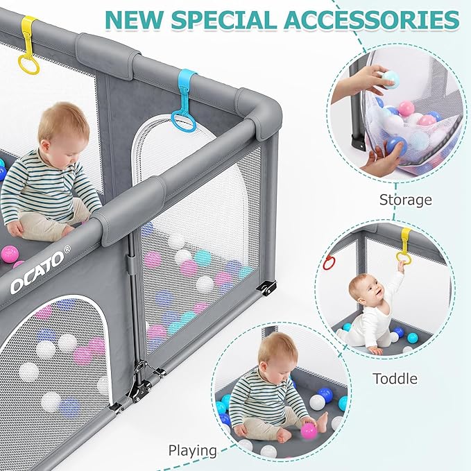 - NEW SPECIAL ACCESSORIES: New upgraded baby gate playpen. Our playpen for toddlers added ocean ball x50, hanging ring x4, storage bag x1, storage strap x2. When the mom is busy, the baby can practice standing and walking through the hang ring, perfect size and height for babys to grip. Bright ball catches baby‘s attention, great entertaining extra large playpen for toddlers