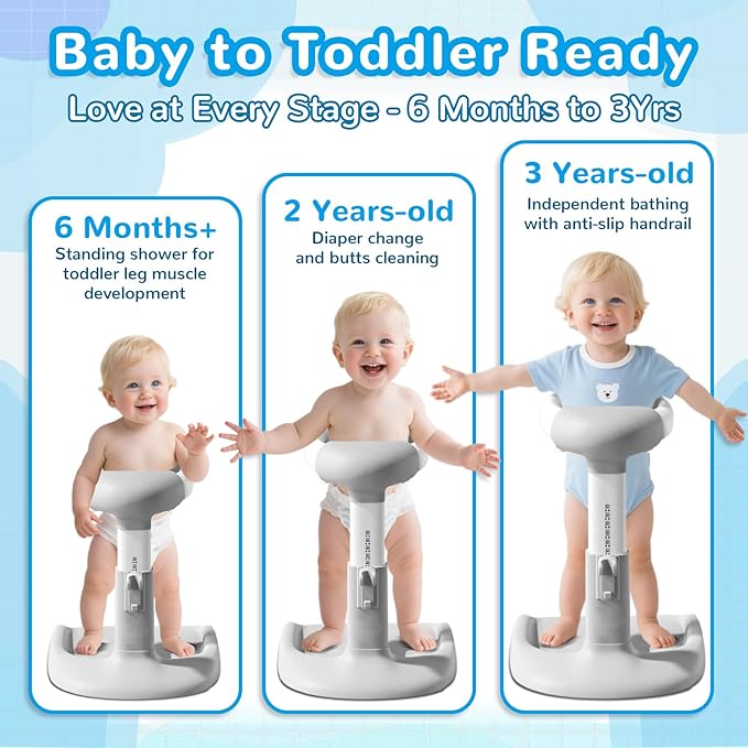 - 【Ergonomic design】This shower standing support is crafted from safety&non-toxic premium ABS material, features ergonomic backrest, suitable for toddlers aged 8-36 months. It molds to the curve of your baby's back, promoting a healthy standing posture to support their growth.