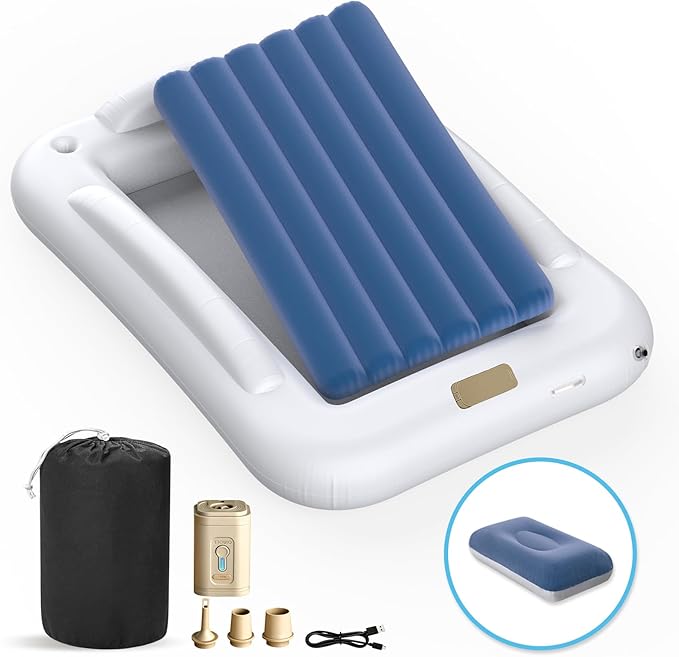 - 【Extra Large Portable Toddler Bed】This toddler travel bed is designed with both portability and space in mind. The large 60-inch size when inflatable toddler travel bed inflated provides plenty of room for kids to play and rest comfortably at the same time, making it ideal for families who are always on the go. Whether you're going camping, visiting family, or just need an extra bed for the night, this lightweight, easy-to-pack toddler air mattress offers the perfect solution.
