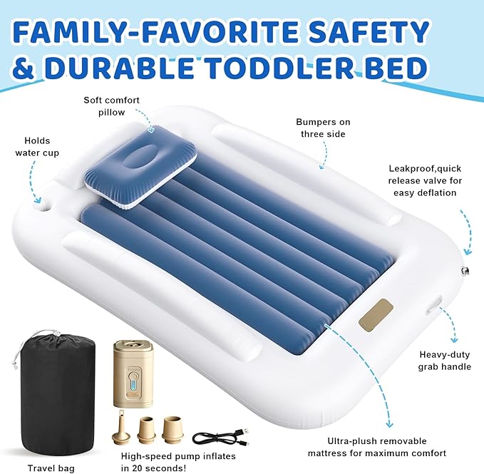- 【Built-in Electric Pump - Easy Inflation】Convenience is key when it comes to inflatable travel bed for kids, and this kids air mattress makes the inflation process simple and fast. It comes equipped with a high-efficiency efficiency electric pump with three different nozzle sizes that allows the baby air mattress to be fully inflated in just minutes. Deflating the bed is equally simple, eliminating the hassle of finding an outlet. Deflation is equally convenient and it can be rolled up and stored in its accompanying carry bag.