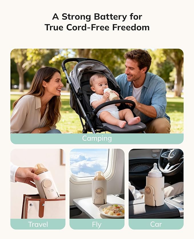 - 【Smart Display & Safe, Easy-Clean Design】An LED screen shows real-time temperature and battery level. The cool-touch PU surface wipes clean instantly, making this bottle warmer on the go both safe and simple to maintain—no scalding risks, no fuss.