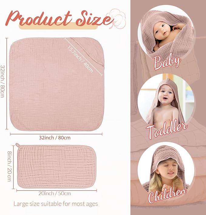 - Baby Towel Set: the baby hooded bath towel set includes 6 pcs baby hooded towels and 6 pcs muslin cotton wash cloths, 6 different colors, 2 pieces of each color (1 towel and 1 wash cloth), the baby towel size is about 32 x 32 inches; Each cloth is about 8 x 20 inches; This provides your baby with a gentle and soothing bath experience, making them feel secure and warm