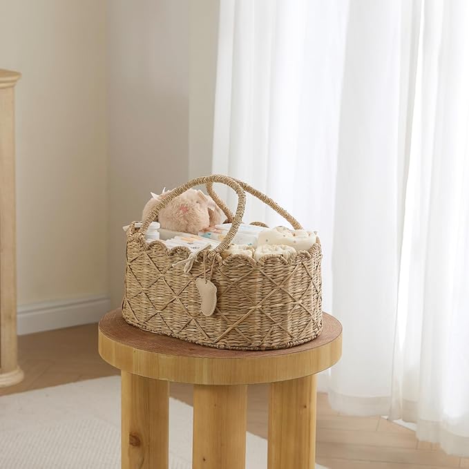 - Natural and Sustainable – Handwoven from natural seagrass, this 15.7" L × 11" W × 6.7" H diaper caddy brings texture and warmth to your space—perfect for a more mindful, sustainable way of living.