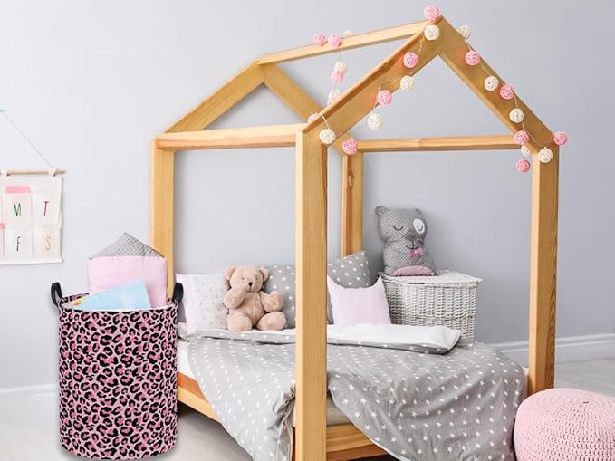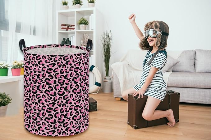 Essme Kids Laundry Basket,Pink Hamper Collapsible Canvas Waterproof Storage Bin for Girls, Leopard Print Hamper,Gift Baskets(Pink Leopard Print)