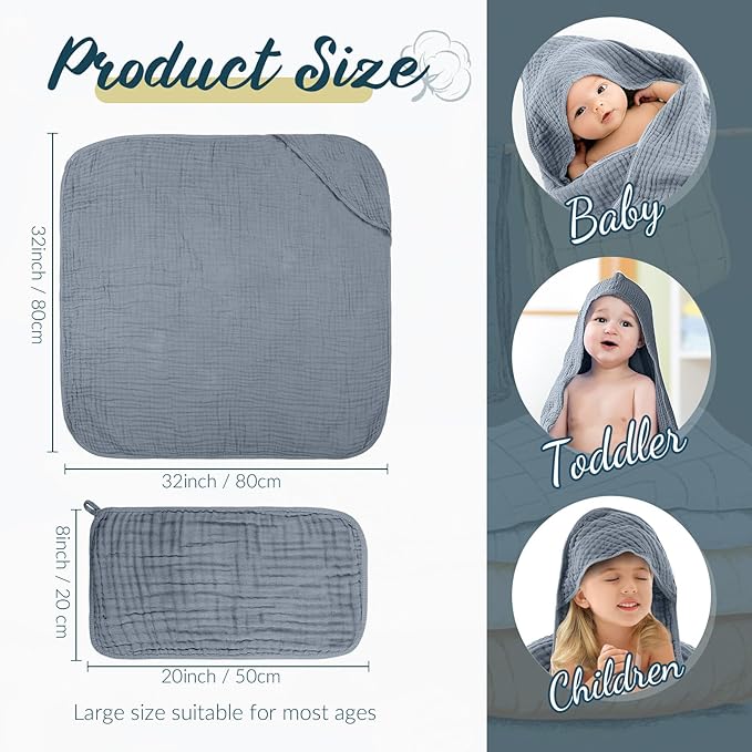 - Baby Towel Set: the baby hooded bath towel set includes 4 pieces of baby hooded towels in light green, light gray, beige, and light blue, the baby towel size is about 32 x 32 inches; 4 Pieces muslin cotton wash cloths in light green, light gray, beige, and light blue, each cloth is about 8 x 20 inches; This provides your baby with a gentle and soothing bath experience, making them feel warm and secure