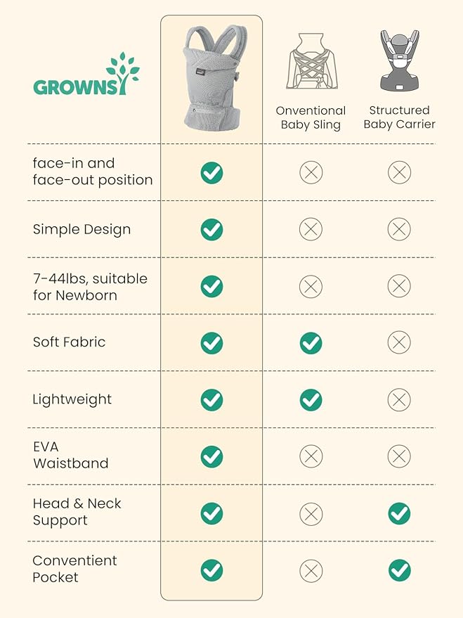 - Soft And Skin-Friendly Fabric: GROWNSY infant carrier is made from Soft and breathable fabric, Like a mother's embrace, provides babies comfortable and secure feeling protect baby's delicate skin. Provide your baby with a warm and comfortable experience, helping to build a close and trusting relationship between you and your baby