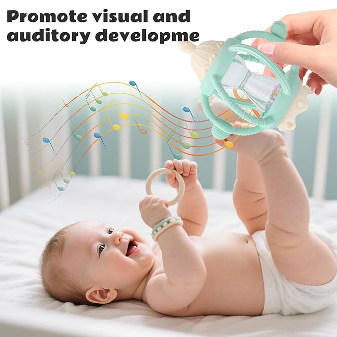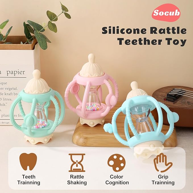 - 2-in-1 Teether & Rattle Combo- Designed for babies 0 months and up, this toy combines a soothing teether and a fun rattle. The sandglass is made of durable ABS and filled with colorful beads that create gentle, crisp sounds when shaken—ideal for visual and auditory stimulation.