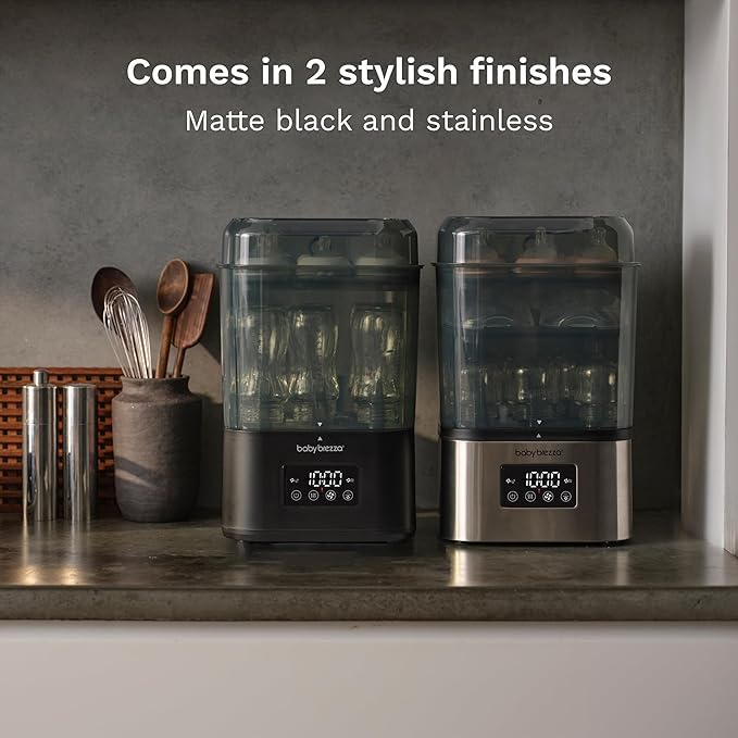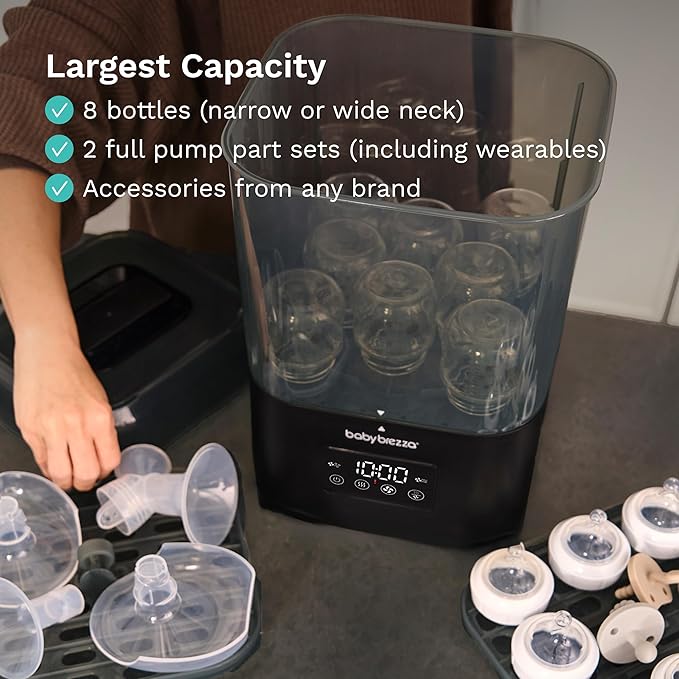 Baby Brezza 10 Minute SuperQuick Bottle Sterilizer + Dryer - Large 8 Bottle Capacity - Steam Sanitization – Universal Fit for All Bottles: Plastic + Glass + Pacifiers + Breast Pump Parts, Matte Black