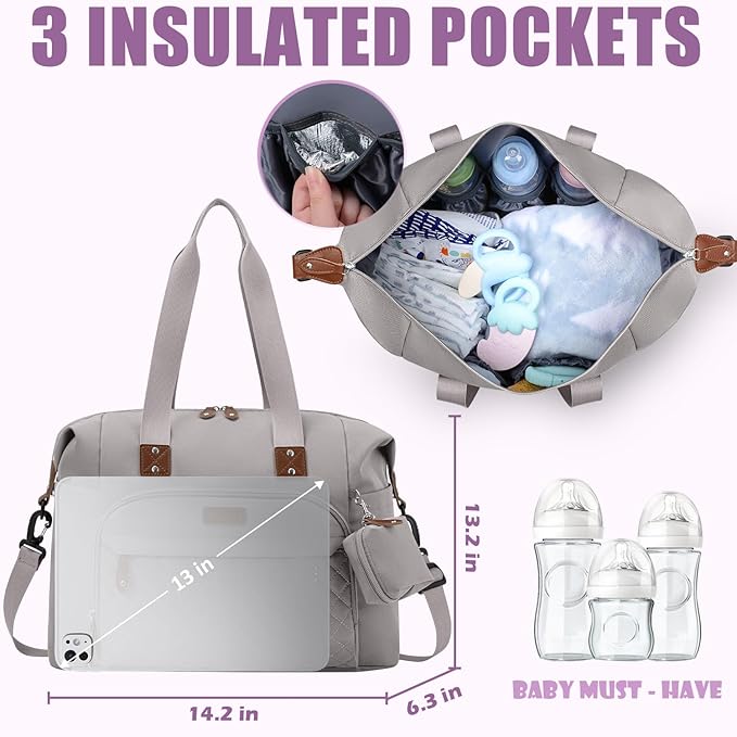 - Spacious and Organized Storage: Tuwubi large diaper bag tote features a roomy main compartment with two-way zippers, offering ample space for essentials such as formula, diapers, and clothing. It includes two dedicated bottle pockets and a waterproof internal compartment for clean clothes, In addition, there are multiple compartments for independent storage,ensuring everything you need is neatly organized and easily accessible.
