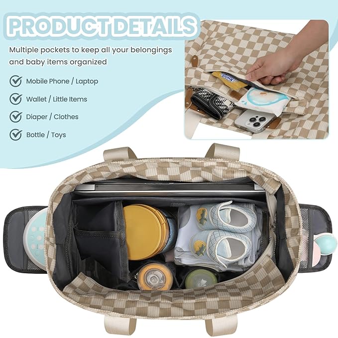 Large Travel Diaper Bag Tote with 14 Inch Laptop Sleeve, Breast Pump Bag for Mom and Dad, Mommy Maternity Travel Baby Bag for Boys and Girls, Plaid